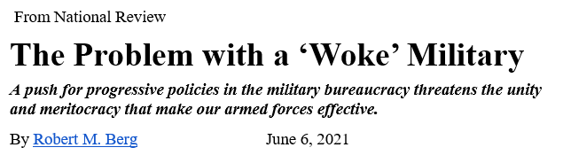This should scare every American, but it won't because most Americans will be kept in the dark about the social engineering that is underway in the U.S. military. Some of us, retired military, are following it. Richard Berg (Pen Name) has an article printed in National Review magazine that outlines the dangers ahead.