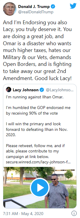 News/Commentary: Townhall's Katie Pavlich reports, "President Trump has officially endorsed Rep. Ilahn Omar's opponent." President Donald Trump took to Twitter this morning to endorse Lacy Johnson, the man running to defeat Democrat Congresswoman Ilhan Omar in the fall.