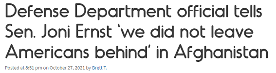 Would you like to hear a federal government bureaucrat who is unable to speak a simple truth? There are probably many examples out there but this one in particular shows just how bad it can be. Iowa Sen. Joni Ernst asked DoD Under Secretary for Policy, Dr. Colin Kahl, a straight forward question about Americans left behind in Afghanistan. Dr. Kahl was unable to admit the obvious. So, Sen. Ernst turned to Lieutenant General James Mingus of the Joint Chiefs of Staff, who was seated beside Dr. Kahl, and asked him the same question which he answered directly. Watch. These political appointees are obfuscating and deliberately misleading the American people about what was done leading up to, and the aftermath, of the United States "retrograde" (Translation: Retreat) from Afghanistan.