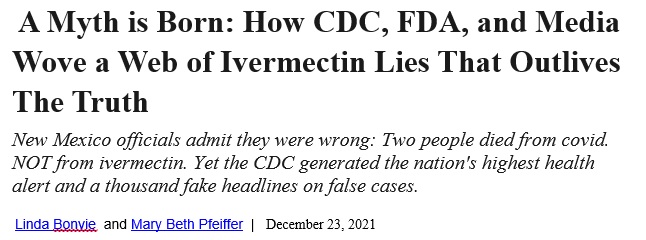 When historians decades/centuries from now attempt to understand what was happening in the world in the early 2020s, specifically the United States, I hope they come across this story. It's a story of how Public Health authorities deliberately misled the public about treatments that were immediately available to combat the symptoms and dangers posed by the COVID-19 virus that had infected millions around the world. It took freelance investigative journalists to uncover the story because the mainstream media refused to get and report the facts. In fact, the media in many respects contributed to the ruse and were complicit in squashing stories challenging the accepted government narrative. Here's the story titled, "A Myth is Born: How CDC, FDA, and Media Wove a Web of Ivermectin Lies That Outlives The Truth":