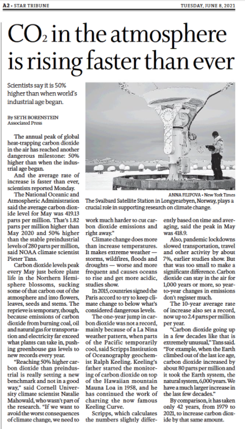 More garbage "reporting" from the StarTribune this morning. They would have us believe CO2 levels are rising faster than EVER." EVER! Well, since the late-1800s ... which is EVER. These headlines are so ridiculous and dishonest. FACT: CO2 levels are far less than 10% what they once were on Earth. Far less. Fact check it. What's embarrassing is that these "reports" go unchallenged and taken as fact. They're not. They are sensationalized to keep climate-alarmism going. Few climate scientists question whether it's a good idea to place CO2 monitoring equipment on the top of a volcano.