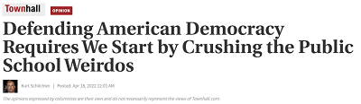 Townhall's Kurt Schlichter has pin-pointed where problems exist in our public schools, and they are "our" public schools, not the misfits who have tried to take them over. Anyone seeing Tik Tok videos of "teachers" feeling a need to share their "gender identities" with Kindergartners knows what he's talking about.