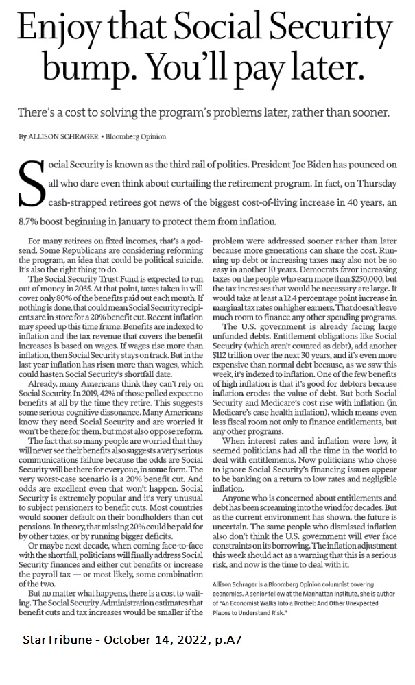 I missed this story when it was first reported. The StarTribune reported in September 2017 that "Minnesota's public-pension system is in crisis, new data shows." We have to address this situation sooner rather than later. Minnesota isn't unique facing the underfunding of its public-pension programs, it's situation pervasive throughout the U.S. We're kidding ourselves if we think this situation is simply going to disappear. Step one: Start using conservative estimates in financial projection models. Expecting 7-8% annual returns, especially with today's highly volatile markets, is foolish. Let's stop being foolish.